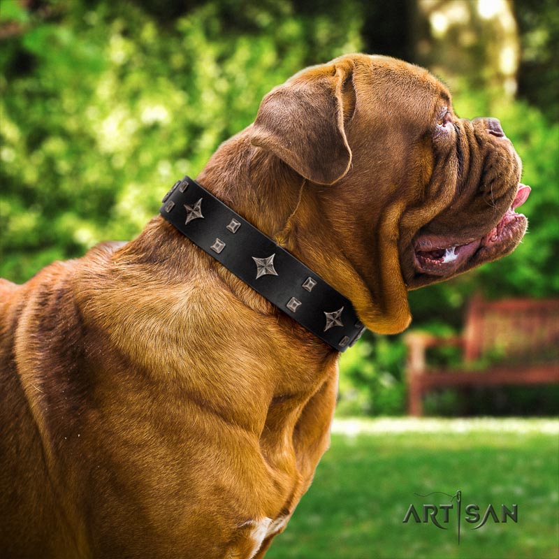 Do you admire elegant style? Allow your adorable dog take joy in wearing such collars on! Choose this impressive leather dog collar with decorations from FDT Artisan. This gear is created for those who just love stylish things. In this extraordinary collar, your Dogue de Bordeaux will have more strict, but handsome look. Your attractive Dogue de Bordeaux will get the finest treatment when wearing this accessory. Full grain natural leather is hypoallergenic and totally eco-friendly.