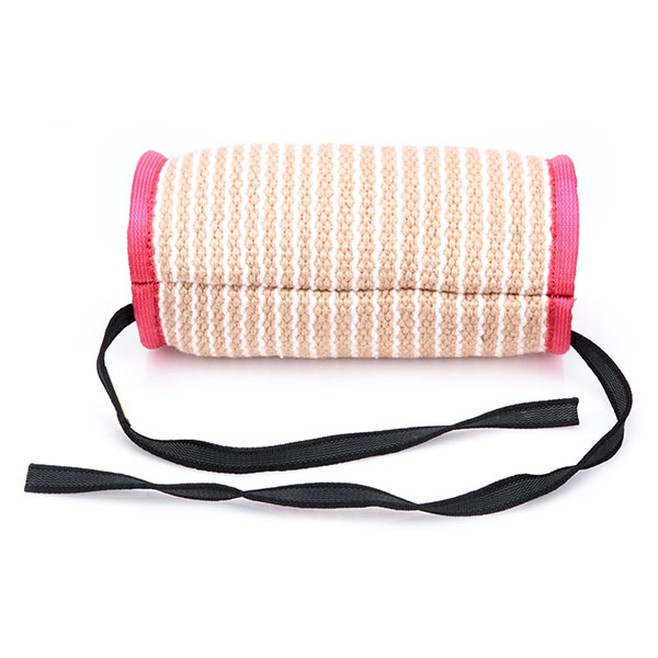 A cylindrical dog bite tug trains a dog to open jaws widely while gripping. The dog training barrel is great in use as a fetch tug, for motivation and drive of young and adult dogs.